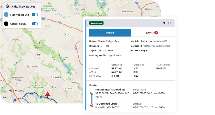 - Visualize distance and time deltas directly on the map at a fleet-wide level or drill down to each route
