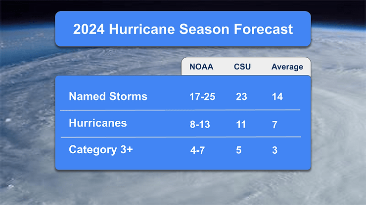 Compared to an average hurricane season (1991-2020), which typically features 14 named storms, seven hurricanes, and three major hurricanes, NOAA and CSU are predicting an 85% and 57% increase in hurricanes for 2024.